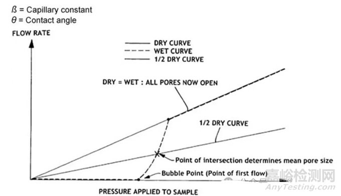 通過記錄材料流量(L/min)與壓力的關系,建立干膜流量曲線;再繪制一個假設空氣流量干膜流量一半的曲線,稱為干膜半流量曲線;然后按照ASTM F-316的方法繪制濕膜流量曲線。濕膜流量曲線的第一個氣泡點如圖10中所示。