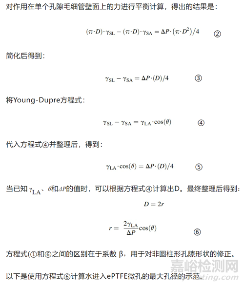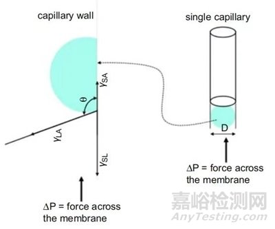 壓力與膜孔徑大小之間的關系可以用Young-Laplace方程來表達。最大孔徑是根據第一個氣泡點計算得出的,平均流動孔徑是從濕膜流量曲線和干膜半流量曲線交點處壓力計算得到,最小孔徑則根據從濕膜流量曲線和干膜流量曲線交點處的壓力值確定的。雖然膜中存在最小和最大孔徑,但平均流量孔只是一個理論計算值,沒有物理意義。耐水壓是指使水通過干燥疏水膜最大開口處所需的最小壓力,與開口大小成反比,而且取決于膜的聚合物物性。耐水壓代表著過濾器對水的阻擋能力,影響耐水壓的因素包括孔徑大小、液體表面張力、膜的表面自由能以及最大開口的尺寸。耐水壓的測試,如對ePTFE這類疏水膜的測試,提供了一個相對方法來衡量膜孔的大小。假設一種情況,即液體(如水或異丙醇)在壓力作用下與因液體表面能導致的毛細管疏水阻力發(fā)生對抗。當液體壓力足夠大到克服該作用力時,它將促使液體通過ePTFE膜,對接觸水滴的單個毛細管進行軸向力平衡分析(圖11):