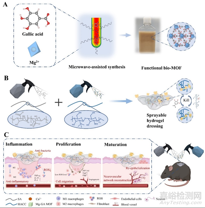 圖1.(a)Mg-GA MOF的合成,(B)含Mg-GA MOF的可噴涂水凝膠敷料的合成,以及(C)促進(jìn)慢性糖尿病傷口修復(fù)的機(jī)制示意圖