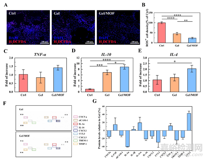 本研究通過(guò)一系列實(shí)驗(yàn)驗(yàn)證了Gel/MOF可以通過(guò)降低氧化應(yīng)激和調(diào)節(jié)炎癥反應(yīng)來(lái)加速體內(nèi)炎癥—增殖轉(zhuǎn)變。對(duì)再生組織進(jìn)行胞內(nèi)總活性氧免疫熒光染色,結(jié)果顯示與對(duì)照組相比,術(shù)后第8天Gel和Gel/MOF處理后的ROS+細(xì)胞密度極其顯著地降低,且Gel/MOF的ROS+細(xì)胞密度顯著低于凝膠組,表明MOF的存在促進(jìn)了ROS的清除并極大地緩解了糖尿病傷口中氧化應(yīng)激的微環(huán)境。進(jìn)一步地使用RT-qPCR檢測(cè)再生皮膚組織中的炎癥相關(guān)基因,結(jié)果顯示,盡管Gel/MOF組中的TNF-α基因表達(dá)沒(méi)有顯著降低,Gel/MOF組中的抗炎因子IL-10和IL-4的表達(dá)顯著高于對(duì)照組和Gel組。此外,從Gel和Gel/M0F組提取蛋白,然后使用細(xì)胞因子蛋白陣列檢測(cè)炎癥相關(guān)蛋白。在Gel/MOF組中,促炎因子及相關(guān)趨化因子地表達(dá)降低,而抗炎因子IL-1ra增加(圖8)。結(jié)果均表明,在Gel敷料中加入MOF可增強(qiáng)M1型巨噬細(xì)胞向M2型極化,并積極調(diào)節(jié)炎癥微環(huán)境,降低氧化應(yīng)激以促進(jìn)傷口愈合。