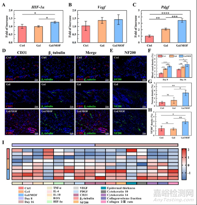 氧化應(yīng)激微環(huán)境直接影響血管和神經(jīng)再生。為了研究MOF維持氧化還原穩(wěn)態(tài)是否可以在增殖階段期間促進(jìn)血管神經(jīng)再生,研究人員檢測(cè)了再生組織的血管相關(guān)基因并對(duì)血管和神經(jīng)元進(jìn)行CD31、β3-微管蛋白和NF200免疫熒光標(biāo)記。Gel/MOF處理后HIF-1α表達(dá)與TNF-α相似。Mg-GA MOF釋放Mg2+上調(diào)Vegf和Pdgf的表達(dá)。同時(shí),免疫熒光結(jié)果顯示Gel/MOF組可見(jiàn)大量CD31表達(dá)且在其周?chē)尸F(xiàn)大量連續(xù)條狀的β3-tubulin+著色,而對(duì)照組及Gel均較少(圖9)。這些結(jié)果表明Gel/MOF促進(jìn)血管內(nèi)皮細(xì)胞的增殖、遷移和新血管的形成,同時(shí)伴隨著新生的神經(jīng)網(wǎng)絡(luò),其治療后的皮膚具有更好的修復(fù)效果。