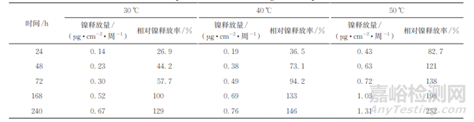 由表1可知:40℃遷移72h所得相對(duì)鎳釋放率為94.2%,說(shuō)明40℃下快速預(yù)報(bào)時(shí)間大于72h;50℃遷移48h所得相對(duì)鎳釋放率為121%,說(shuō)明50℃下快速預(yù)報(bào)時(shí)間小于48h。綜合考慮,試驗(yàn)選擇50℃作為快速預(yù)報(bào)的遷移溫度。
