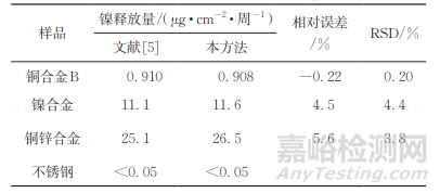 由表2可知,不銹鋼樣品中無(wú)鎳釋放,其他3種樣品中鎳釋放量和歐洲標(biāo)準(zhǔn)方法的基本一致,相對(duì)誤差的絕對(duì)值和 RSD 均小于6.0%,說(shuō)明方法的準(zhǔn)確度和精密度均較高。
