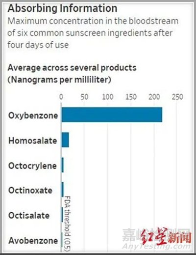 根據(jù)FDA的規(guī)定,如果血液中發(fā)現(xiàn)活性成分的含量為每毫升0.5毫微克(ng/mL)或更高,就應(yīng)該對其進(jìn)行分析,以確定成分是否存在增加患癌癥、出生缺陷或其他副作用的風(fēng)險(xiǎn)。而FDA近期檢測的6種防曬化學(xué)物質(zhì)的最大濃度范圍為每毫升3.3~258.1毫微克,遠(yuǎn)遠(yuǎn)超過了安全閾值。