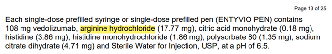 Entyvio 將108mgVedolizumab抗體裝載于0.68mL溶液,抗體濃度遠(yuǎn)大于100 mg/mL。精氨酸通常用于降低粘度,抑制聚集,并在產(chǎn)品儲(chǔ)存和運(yùn)輸期間用作Bufer穩(wěn)定劑。