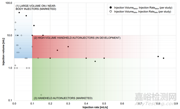 目前的研究主要集中在大體積/低速率和小體積/高速率范圍裝置,大容量/高速率范圍給藥設(shè)備仍在研究中以實(shí)現(xiàn)設(shè)備高達(dá)0.5 - 1.0 mL/s的注射速率,達(dá)到小于15 s的注射時(shí)間。