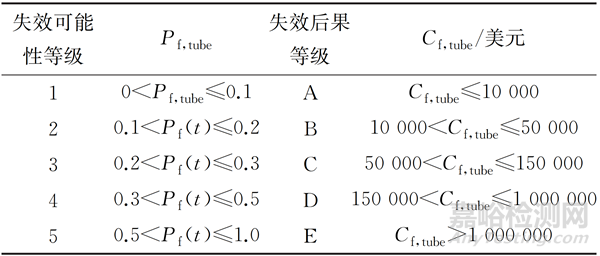 風(fēng)險矩陣是識別高風(fēng)險管束的重要可視化工具,需要分別確定Pf,tube和Cf,tube所屬的等級,然后在二維風(fēng)險矩陣中表示出管束的風(fēng)險等級,Pf,tube和Cf,tube的等級分類如表1所示。