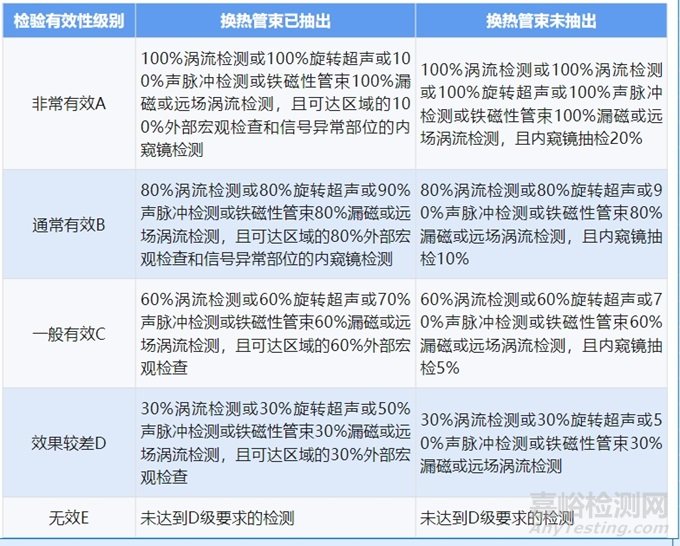 表4 換熱管束腐蝕減薄的檢驗有效性分級與檢驗方法
