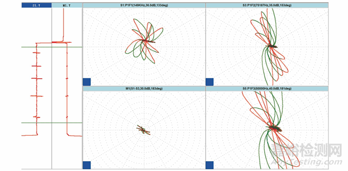 合金20是ASTM-SB 729標準中的材料型號,檢測前依據(jù)NB/T 47013.6-2015中關(guān)于差動探頭靈敏度調(diào)試的要求進行多次調(diào)試,最終選擇三個頻率進行檢測,分別為f1=150 kHz,f2=75 kHz,f3=50 kHz。同時,設(shè)置f1與f3為混頻抑制折流板信號,記為M1通道,其他檢測工藝參數(shù)為:探頭外徑22 mm,檢測速度10 m/min。II型對比試樣的檢測圖譜如圖2所示。