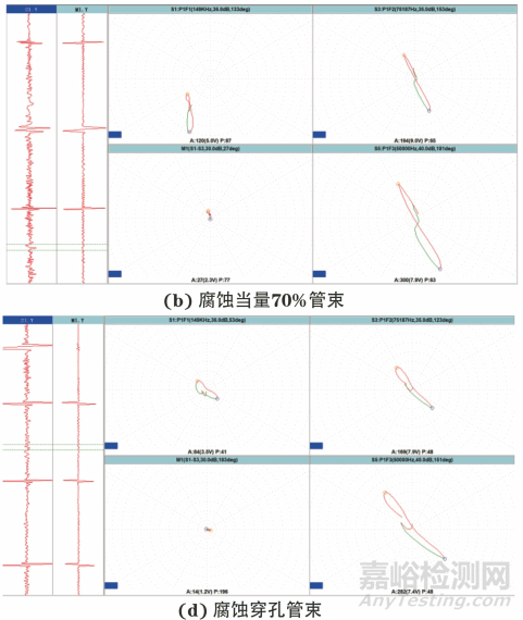 在檢測過程中嚴格按照標準要求進行靈敏度檢查和復(fù)驗。經(jīng)檢測發(fā)現(xiàn),存在缺陷的管束為22根,其中包括穿孔5根,并通過水壓試驗進行驗證,如圖3所示,證明了渦流檢測穿孔缺陷的可靠性,統(tǒng)計結(jié)果見表5,典型腐蝕缺陷渦流檢測圖譜見圖4。