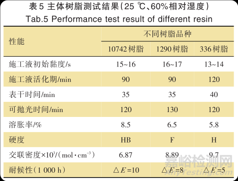 3 種樹脂 10742、1290、336 對清漆及其涂膜性的影響如表5所示。