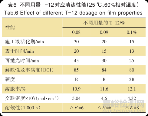 在清漆中添加T-12,考察清漆的干澡速度和活化期以及其他各項漆膜性能。隨著用量的增加,漆膜前期的固化速度和交聯(lián)密度會有明顯提升,拋光時間大大縮短,伴隨著活化期、表干時間也縮短以及后期漆膜性能的不利影響。其用量控制在 0.1%以內(nèi),但過量使用時,對施工活化期和漆膜表干時間、外觀、硬度以及其他潛在漆膜性能都會有更消極的影響。根據(jù)表 6 數(shù)據(jù)可知,加入T-12量0.08%~0.1%時,可以滿足快修要求,其中添加0.1%時的漆膜外觀、硬度、耐候等性能明顯下降,因此添加0.09%為最優(yōu)效果;但是其活化期、表干時間以及后期漆膜外觀、交聯(lián)密度、硬度還有待改善。