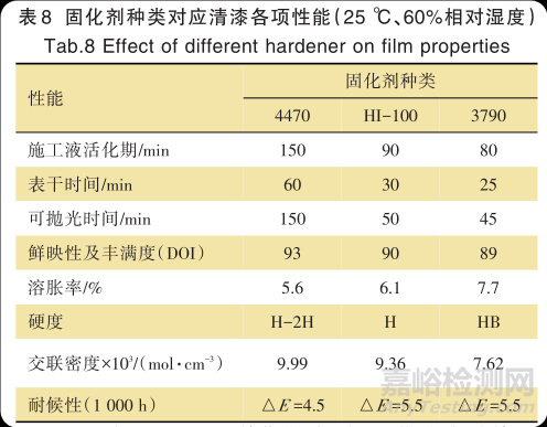 3790 相比 HI-100 前期的交聯(lián)、固化速度稍快一些,表8是 4470、HI-100、3790 三者后期的漆膜性能。根據(jù)數(shù)據(jù)可知,3790 后期外觀、硬度、交聯(lián)密度降低,并且表干時間也縮短;4470相比HI-100則是明顯降低干燥速度,提升漆膜后期的外觀、硬度、交聯(lián)密度、耐候等漆膜性能,可以考慮HI-100與4470的混拼使用。