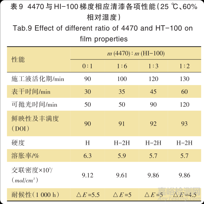 在 2.1 中確定的清漆組分基礎(chǔ)上,探究 HI-100 與4470配比對漆膜性能的影響。根據(jù)表9數(shù)據(jù)可知,固化劑按 m (4470): m (HI-100)=1∶6 時,相比純 HI-100的表干時間有所延長,后期漆膜外觀、硬度、交聯(lián)密度、耐候等性能也有所提升。