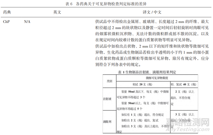 ChP中目前生物制品和非生物制品對于微細可見異物的復(fù)檢要求有所不同,隨機再抽取20支,根據(jù)制劑類型不同(注射液、注射用無菌制劑及無菌原料藥)、給藥方式的不同制定了不同的判定標準,詳見表6。ChP 2020對生物制品和非生物制品進行分別規(guī)定是在沒有進行充分評估調(diào)研和協(xié)調(diào)討論之前的一種過渡處理,目前生物制品的標準規(guī)定相比于非生物制品稍寬松一些,但既然以同種劑型同途徑給藥,可見異物就應(yīng)該制訂相同標準。最終藥典標準只應(yīng)是根據(jù)給藥途徑的安全性風(fēng)險不同,比如肌肉注射與靜脈注射,才能適當(dāng)制訂不同的標準。