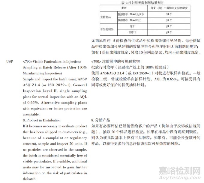 USP中給出了生產(chǎn)后出廠放行與貨架期產(chǎn)品的不同判定標準。放行標準是按照統(tǒng)計學(xué)的方式計算出不可以出現(xiàn)微細可見異物的數(shù)量,對貨架期產(chǎn)品的要求是抽樣檢查20支,如果樣品中沒有檢出可見異物,該批次則可視為基本上不含可見異物。