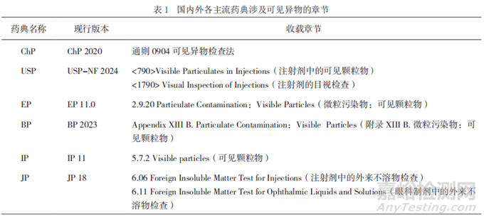 ChP 2020中通則0904收載了可見異物檢查法[9],USP-NF 2024中為<790>Visible Particulates inInjections(注射劑中的可見顆粒物)[10]和<1790>Visual Inspection of Injections(注射劑的目視檢查)[11],EP11.0在通則2.9.20 中收載了ParticulateContamination:Visible Particles(微粒污染物:可見顆粒物)[12],BP 2023中為 Appendix XIII B.Particulate Contamination:Visible Particles(附錄XIII B.微粒污染物:可見顆粒物)[13],IP 11中為5.7.2 Visible Particles(可見微粒物)[14],JP 18中為6.06 Foreign Insoluble Matter Test for Injections(注射劑中的外來不溶物檢查)[15]和6.11 ForeignInsoluble Matter Test for Ophthalmic Liquids andSolutions(眼科制劑中的外來不溶物檢查)[16]。上述各藥典涉及可見異物的章節(jié)詳見表1,后續(xù)文章中在描述各國藥典時均指表1中提到的版本,不再贅述版本號。
