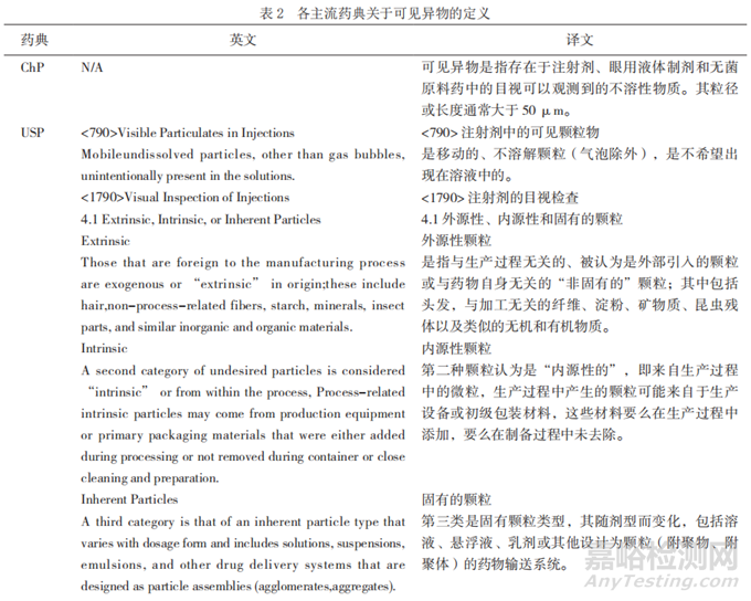 ChP 2020中將可見異物描述為“是指存在于注射劑、眼用液體制劑和無菌原料藥中的目視可以觀測到的不溶性物質(zhì)。其粒徑或長度通常大于50 μm”;EP、BP、IP對于可見異物的定義相似,指出了可見異物“是不希望存在于溶液中的、移動的、不溶解的微粒”;JP除此之外還指出可見異物具有外來的屬性。USP也指出了可見異物是不希望存在的、移動的、不溶解的,并根據(jù)來源將可見異物詳細分為三類:固有異物(產(chǎn)品性所固有的顆粒)、內(nèi)源性異物(來自生產(chǎn)設(shè)備、產(chǎn)品配方或容器系統(tǒng)的顆粒)和外源性異物(源自生產(chǎn)環(huán)境的顆粒,是生產(chǎn)工藝外的異物)。具體詳見表2。