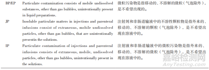 歸納起來,上述藥典指出了可見異物具有以下特點:1)是不溶解于藥液中的;2)在一定條件下目視可以觀測到;3)是藥品研發(fā)者或生產(chǎn)者不希望在藥品溶液中出現(xiàn)的;4)可移動的;5)外來的。第一點所有藥典均提到了。第二點只有ChP明確在定義中提到了。“3)和4)”只有ChP沒有提到。“5)”只有JP和IP提到了。從科學(xué)性分析,可見異物用前3個特點來定義較為適宜,“4)和5)”則不是必須的,因為可見異物有時是從外界引入的,在一定條件下確實也可以移動,但如果說必須是外來引入的且具有移動性才是可見異物則是不夠準確和全面的。