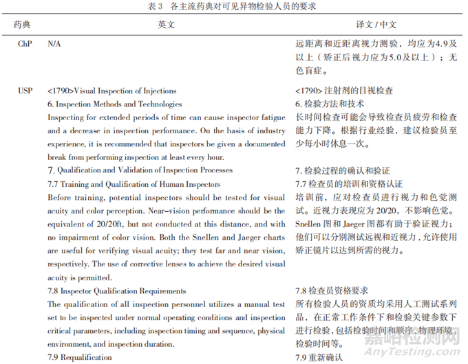 ChP中規(guī)定了檢查人員應(yīng)符合的視力條件:遠距離和近距離視力測驗,均應(yīng)為4.9及以上(矯正后視力應(yīng)為5.0及以上);無色盲癥。USP<790>、BP、EP、IP及JP中均沒有明確檢驗人員的視力要求。USP<1790>中建議檢查人員每小時休息一次;檢驗人員在培訓(xùn)前需要進行視力和顏色感知測試,允許使用矯正鏡片來達到所需視力,檢驗人員應(yīng)至少每年重新獲得一次資質(zhì)。各國藥典對可見異物檢驗人員的要求詳見表3。