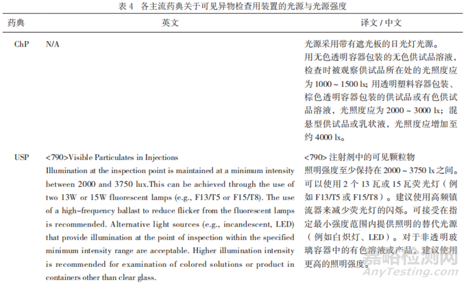 USP、EP、BP、IP對光源照度的規(guī)定基本一致,均要求光照范圍應(yīng)在2000~3750 lx之間,對于有色玻璃和塑料容器而言,需要更高的照度,但并未給出對這類樣品建議的照明強度。JP規(guī)定對一般注射劑的照明強度同樣在2000~3750 lx;對于塑料容器包裝的含水注射劑,照明強度應(yīng)在8000~10000 lx之間;對于眼用制劑,光照強度應(yīng)在3000~5000 lx之間。USP寫明對于半透明塑料容器或琥珀色容器,需要增加光照強度,比如8000~10000 lx,或從容器后定向照明,或轉(zhuǎn)移到干凈透明的容器中觀察。ChP對不同檢品也有不同的照度規(guī)定,1000~1500 lx適用于無色注射液和滴眼液;2000~3000 lx適用于透明塑料容器或有色注射液或滴眼液;4000 lx適用于混懸注射液和滴眼液中色塊、纖維毛等外來污染物的檢查。根據(jù)實踐經(jīng)驗,ChP規(guī)定的1000~1500 lx光照度有些偏低,容易使檢出率偏低。但其他藥典規(guī)定的8000~10000 lx極易使人眼疲勞,檢驗人員連續(xù)工作時間比在2000~3750 lx光照條件下觀察持續(xù)時間大幅縮短。各主流藥典關(guān)于可見異物檢查用裝置的光源與光源強度的詳細內(nèi)容見表4。