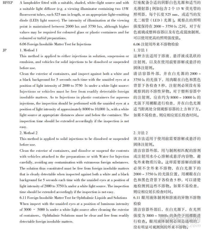 通過比較分析,結(jié)合生產(chǎn)與檢驗實踐經(jīng)驗,認為以下一些國外藥典的優(yōu)點值得將來ChP通則修訂時學(xué)習(xí)借鑒:USP對于可見異物檢查人員的經(jīng)驗要求內(nèi)容;半自動燈檢法描述內(nèi)容,因為國內(nèi)生產(chǎn)中也有這種儀器在使用;光照強度范圍,以及從實驗室延伸至生產(chǎn)過程的可見異物監(jiān)控方法等。