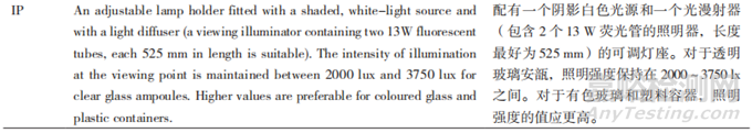 ChP中明確規(guī)定為帶有遮光板的日光燈光源;EP、BP、IP對于光源的要求一致,使用配有適宜的遮光白光源和燈光擴散器[例如包含2個13 W熒光燈管的觀察照明器,每個波長525 mm,或一個適宜的發(fā)光二極管(LED)光源)];USP<1790>建議使用的光源是熒光燈(最好配備高頻鎮(zhèn)流器以減少可見閃爍)、白熾燈(會伴隨有熱量釋放)或LED燈(節(jié)能、穩(wěn)定且不放熱),并同時指出這些光源均屬于漫反射光源,能避免出現(xiàn)眩光,有利于直接觀察。