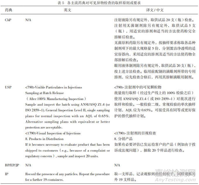 檢驗用藥品的取樣要保證檢驗結(jié)果盡可能反映總體的情況[17]。所抽取的樣品對全部樣品要具有充分的代表性。BP、EP和JP均沒有規(guī)定可見異物檢測的取樣支數(shù);IP僅指出了需檢測20支樣品;ChP對實驗室檢驗規(guī)定的比較詳細,按照GMP附錄的取樣原則進行隨機取樣,并根據(jù)制劑的類型分別給出了取樣支數(shù):注射液取20支(瓶),注射用無菌制劑取5支(瓶),無菌原料藥按各品種制劑項下的最大規(guī)格量取5份,眼用液體制劑取20支(瓶);USP的取樣原則針對企業(yè)放行檢驗,取樣量需根據(jù)產(chǎn)量的不同計算出不同的取樣量,采用ANSI/ASQZ1.4(或 ISO 2859-1)標準進行抽樣和檢查。通常檢查水平II,正常檢查的單次抽樣計劃的接收質(zhì)量限(Acceptable Quality Limit,AQL)為0.65%。另外,USP對于已售出的產(chǎn)品,取樣數(shù)量為20支。具體詳見表5。