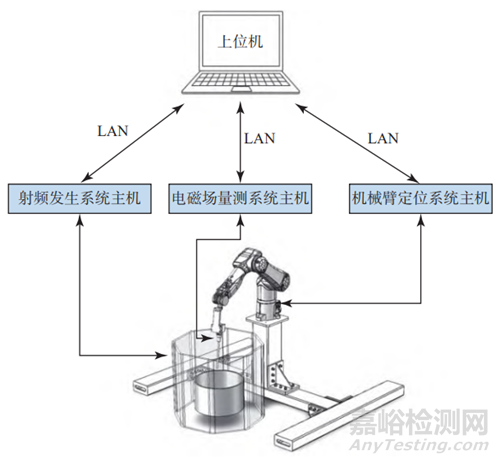 除了硬件系統(tǒng),軟件環(huán)境的構建也至關重要。各硬件系統(tǒng)通過局域網(wǎng)(local area network,LAN)連接至PC上位機,由上位機軟件統(tǒng)一對其進行控制,實現(xiàn)射頻場控制、機械臂運行控制和電磁量測控制等功能,從而形成三位一體的集成測試環(huán)境。測試系統(tǒng)總體設計框架如圖1所示。