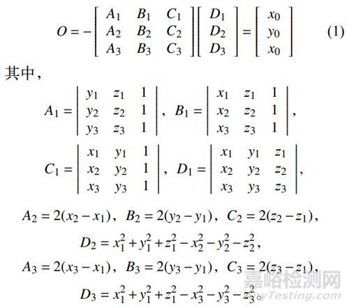 1)求P1,P2,P3共圓的圓心O:令圓心O坐標為(x0,y0,z0),P1坐標為(x1,y1,z1),P2坐標為(x2,y2,z2),P3坐標為(x3,y3,z3),由空間三點P1、P2、P3確定的平面記為平面a,圓半徑記為,則圓心O為: