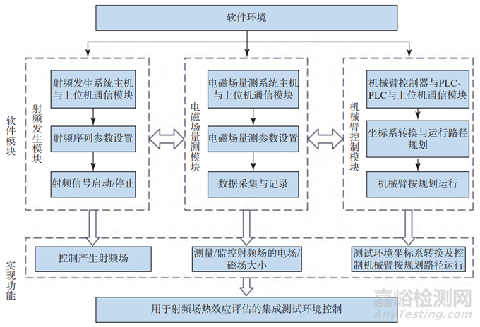 根據(jù)測試需求,與硬件環(huán)境相對應,軟件模塊主要包括射頻發(fā)生模塊、電磁場量測模塊和機械臂控制模塊(見圖3),分別用來實現(xiàn)射頻場控制、射頻場量測和機械臂運行控制三大功能。軟件環(huán)境的構建是將以上3個模塊集成在一個軟件平臺,形成用于射頻場熱效應評估的集成測試環(huán)境,統(tǒng)一進行測試流程的自動化管理和控制。