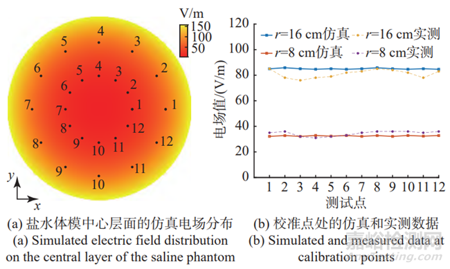 從仿真結果中提取體模中心層面上的電場,其分布如圖6(a)所示。為了驗證測試環(huán)境中實際電場與仿真的一致性,選取體模中心層面,半徑分別為r=16 cm和r=8 cm的圓環(huán)上的24個點作為校準點,使用電場量測探棒對校準點處的電場進行實測,同時也提取上述位點的仿真電場。