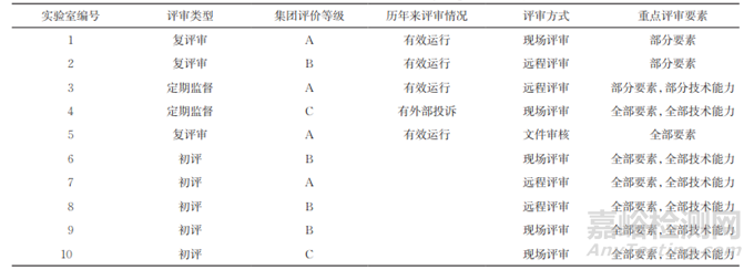 表2列舉了某集團化企業(yè)實驗室某年度的認可評審方案。該集團化企業(yè)實驗室已獲認可數(shù)量為10家,本年度需接受例行評審的實驗室有5家,申請初次評審的實驗室5家。表2中,集團評價等級分為A、B、C、D等4級,代表優(yōu)秀、良好、合格、不合格,評審方式包括現(xiàn)場評審、遠程評審、文件審核、備案審核等。