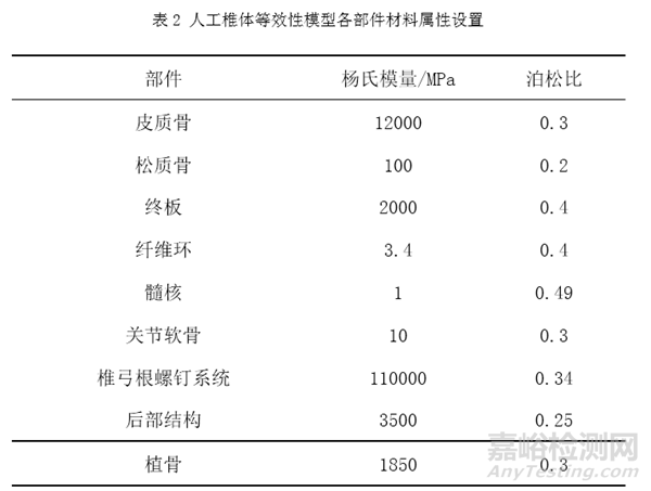 表2列舉了人工椎體等效性模型中常用到的相關(guān)材料及其屬性,其中椎體使用劃分皮質(zhì)骨和松質(zhì)骨的方式對(duì)其賦予材料屬性[3,6-10]。
