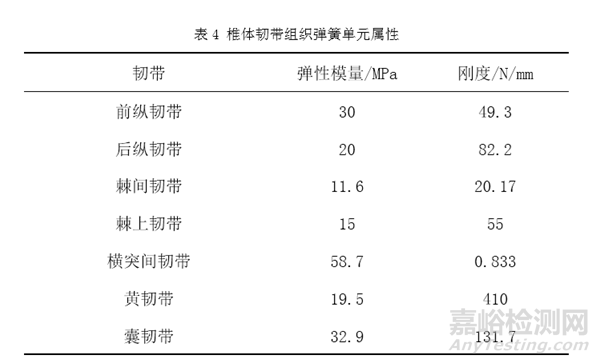 再如人工椎體等效性模型的固定約束條件設(shè)置,對(duì)于椎體關(guān)節(jié)突關(guān)節(jié),由于軟骨層的存在且摩擦系數(shù)極低,建議關(guān)節(jié)突的關(guān)節(jié)面接觸采用無(wú)摩擦接觸[3]。椎間盤(pán)與椎體終板緊密結(jié)合,接觸部位不發(fā)生相對(duì)位移建議采用綁定接觸[14]。固定接觸表面例如螺釘螺紋與骨接觸表面,可使用綁定接觸模擬螺釘?shù)墓潭ㄐЧ鸞8]。人工椎體植入后,其與終板之間的微動(dòng)可忽略,上下終板與人工椎體之間可以采用綁定接觸[3]。人工椎體等效模型中包含的韌帶組織可使用彈簧元件組添加,表4為椎體韌帶組織對(duì)應(yīng)彈簧單元的材料屬性[3,6,7]。