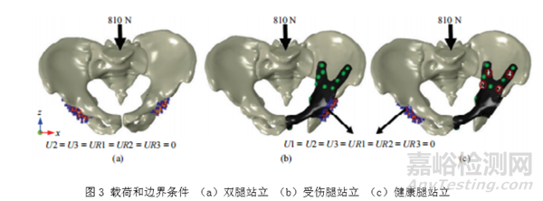 對(duì)于骨盆假體,可考慮的典型的生理活動(dòng)如站立、步行、上下樓梯、下蹲、坐起等。Enchun Dong等人[5]在對(duì)定制式骨盆假體進(jìn)行有限元分析時(shí)計(jì)算了骨盆的三種靜態(tài)條件,即雙腿站立、健康腿(右側(cè))站立和受傷腿(左側(cè))站立。該研究中加載條件和邊界條件設(shè)置如下:骨盆的坐標(biāo)系基于骨盆前平面(APP),X軸平行于包括左右髂前上棘在內(nèi)的線,Y軸垂直于前平面,Z軸垂直于X軸和Y軸,原點(diǎn)位于骨盆的重心。在三種靜態(tài)條件下,即雙腿站立、健康腿(右側(cè))站立和受傷腿(左側(cè))站立,均從骶椎S1頂部沿骨盆縱軸施加810N(1.2*B.W)的載荷。對(duì)于雙腿站立,允許兩個(gè)髖臼杯上的節(jié)點(diǎn)自由水平平移(X方向),但其他5個(gè)自由度受到限制(圖3(a));而左腿和右腿站立時(shí),左右髖臼杯上的節(jié)點(diǎn)分別被完全限制在所有自由度范圍內(nèi)(圖3(2)和(c))。