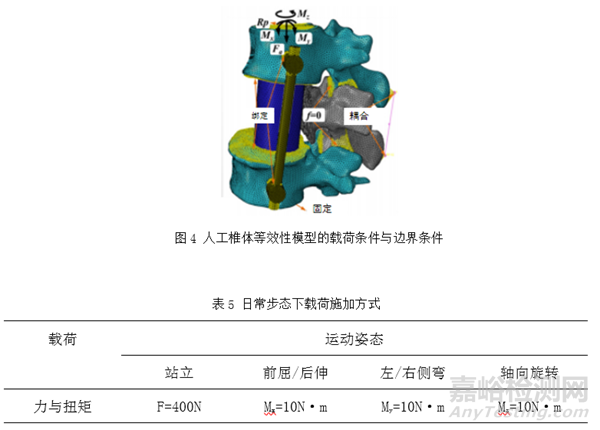 等效的力學(xué)和運(yùn)動(dòng)學(xué)加載條件需盡可能模擬植入物在植入體內(nèi)后所處的真實(shí)力學(xué)環(huán)境,所進(jìn)行的設(shè)置以不產(chǎn)生錯(cuò)誤的應(yīng)力集中為基本原則。等效性模型的加載條件需與臨床預(yù)期使用情況相符,優(yōu)先選取典型生理活動(dòng)下植入物的力學(xué)和運(yùn)動(dòng)學(xué)加載條件。