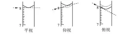俯視時視線斜向下視線與筒壁的交點在液面上所以讀到的數(shù)據(jù)偏高,實際值偏低。