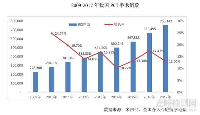 隨著國家經(jīng)濟和社會的發(fā)展,PCI 手術總量不斷上升,冠脈支架使用量也在上升。2017年中國的PCI手術例數(shù)為75萬,則平均每100 萬人有542例患者進行PCI治療,而同期日本每100萬人中超過2,000例患者接受PCI治療,美國超過3,000 例。由此可見,中國人均 PCI 手術量與發(fā)達國家相比仍然處于較低水平。隨著社會經(jīng)濟的發(fā)展及醫(yī)療保障水平的上升,我國 PCI 手術例數(shù)由 2009 年的228,380例增長至2017年的753,142例,復合增長率達到16.09%。由此可見,我國 PCI的需求處于快速釋放中。