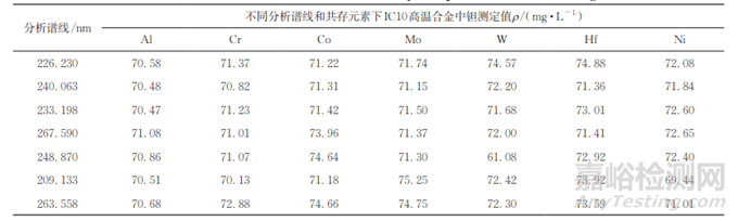 IC10高溫合金元素組分較為復(fù)雜,選擇合適的分析譜線可消除或減少樣品中各元素間的光譜干擾。用水逐級稀釋鉭元素標(biāo)準(zhǔn)儲備溶液,配制40,50,60,70,80mg·L−1鉭標(biāo)準(zhǔn)溶液系列,按照儀器工作條件測定并制作標(biāo)準(zhǔn)曲線。根據(jù)實(shí)際樣品中元素組成及含量,配制分別含鎳600mg·L−1,鋁60mg·L−1,鉻70mg·L−1,鈷120mg·L−1,鎢50mg·L−1,鉿16mg·L−1,鉬16mg·L−1的70mg·L− 1鉭標(biāo)準(zhǔn)溶液,按照儀器工作條件測定,并采用上述制作好的標(biāo)準(zhǔn)曲線測定鉭含量,比較了不同分析譜線下基體元素鎳和其他共存合金元素對鉭檢測的影響,結(jié)果見表1。