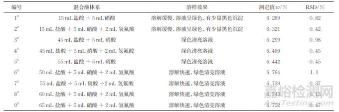 稱取9份0.1400gDZ125(1)標(biāo)準(zhǔn)樣品,按照試驗(yàn)方法分別用9種混合酸體系(1#~9#)溶樣和測定(溶樣后 DZ125(1)中鉭含量和IC10高溫合金中鉭的基本一致),結(jié)果見表3。