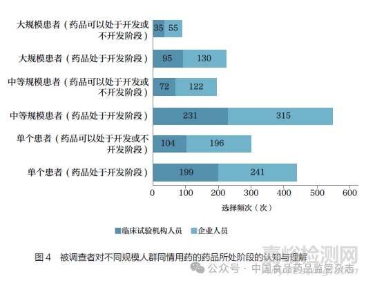 同時,調(diào)查問卷中依據(jù)美國同情用藥經(jīng)驗將適用人群劃分為單個患者、中等規(guī)?;颊咭约按笠?guī)模患者。對于中等規(guī)模以及大規(guī)模患者同情用藥,臨床試驗機構(gòu)與企業(yè)從業(yè)人員對于藥品是否必須處于開發(fā)階段的認知不存在顯著性差異(P>0.05);對于單個患者同情用藥,臨床試驗機構(gòu)人員相比企業(yè)人員對藥品所處階段的要求更加嚴格(P<0.05,圖4)。