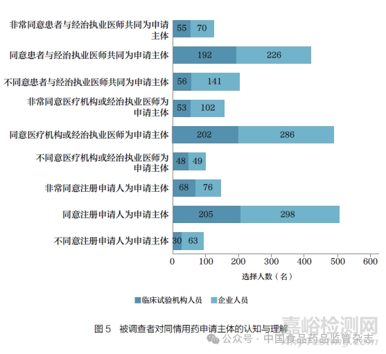 臨床試驗機構(gòu)與企業(yè)從業(yè)人員對于是否將“注冊申請人”以及“醫(yī)療機構(gòu)或經(jīng)治執(zhí)業(yè)醫(yī)師”納入申請主體的認知無顯著性差異(P>0.05), 但企業(yè)人員對于將患者納入申請主體的顧慮較臨床試驗機構(gòu)人員更大(P<0.01,圖5)。此外,在同意或非常同意由注冊申請人向藥品監(jiān)管部門提出申請的被調(diào)查者中,超過95%(636/647)的人認為醫(yī)療機構(gòu)需要對此提供專業(yè)性意見。