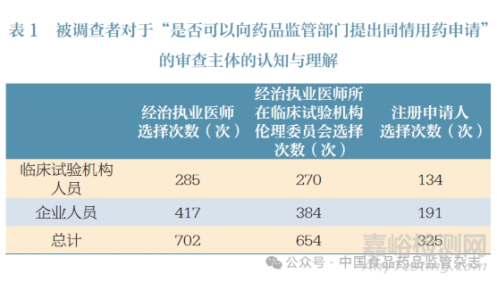 超過85% 的被調(diào)查者認為,同情用藥數(shù)據(jù)應(yīng)當成為藥物上市審批的考慮因素。臨床試驗機構(gòu)與企業(yè)從業(yè)人員對此問題的認知無顯著性差異(P > 0.05)。