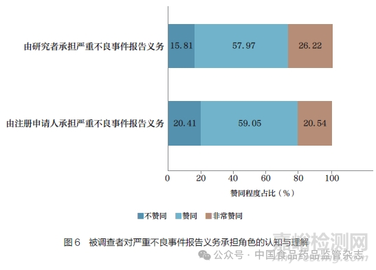 臨床試驗機構(gòu)與企業(yè)從業(yè)人員對于“ 不良事件是否需要被記錄” 的認知無顯著性差異(P>0.05),雙方均有超過95%的人認為在同情用藥期間發(fā)生的不良事件需要或非常需要被記錄。同時,雙方對于嚴重不良事件報告義務(wù)承擔角色的認知也無顯著性差異(P>0.05,圖6)。