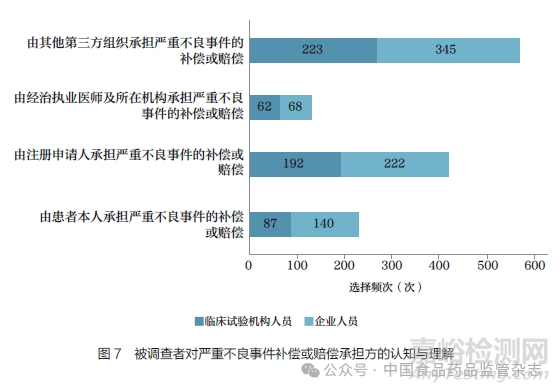 針對嚴重不良事件的補償或賠償問題,臨床試驗機構(gòu)與企業(yè)從業(yè)人員對于承擔方的認知差異較大(P<0.05),企業(yè)人員更傾向于選擇患者本人或其他第三方組織,而臨床試驗機構(gòu)人員更傾向于選擇注冊申請人或經(jīng)治執(zhí)業(yè)醫(yī)師及其所在機構(gòu)(圖7)。另有調(diào)查者補充,補償或賠償?shù)某袚鷨栴}應(yīng)考慮嚴重不良事件與藥品之間的關(guān)系,以及臨床試驗申辦方獲益與否。