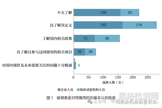 740 名被調(diào)查者中, 僅有239 名(32.30%) 達到了解國內(nèi)同情用藥發(fā)展現(xiàn)狀的水平。該數(shù)據(jù)在一定程度上反映出,我國臨床試驗從業(yè)人員整體對同情用藥的關(guān)注度和參與度有待提高。其中,臨床試驗機構(gòu)與企業(yè)從業(yè)人員對同情用藥的認知水平存在顯著性差異,前者的總體了解程度較高(P<0.001,圖1)。