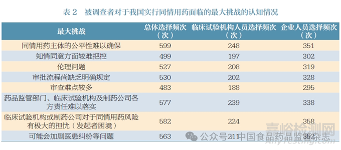 此外,調(diào)查問卷還列舉了同情用藥在我國可能面臨的一系列挑戰(zhàn),由被調(diào)查者選擇其認為的最大挑戰(zhàn)。排名前4 的挑戰(zhàn)依次為:同情用藥主體的公平性難以確保;臨床試驗機構(gòu)或制藥公司對于同情用藥風(fēng)險有極大的擔憂(發(fā)起者困境);藥品監(jiān)管部門、臨床試驗機構(gòu)及制藥公司各方責任難以落實;可能會加劇醫(yī)患糾紛等問題。從被調(diào)查者擔憂的側(cè)重點來看,目前各方對于責任歸屬問題有較大顧慮(表2)。