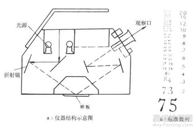 儀器結(jié)構(gòu)原理及其標(biāo)準(zhǔn)數(shù)字板如下圖所示。由光源照射標(biāo)準(zhǔn)數(shù)字板,被標(biāo)準(zhǔn)數(shù)字板反射的光通過2塊反射鏡反射到涂漆試板上;然后,涂漆試板的反射光又被另外2塊反射鏡反射到目視鏡;觀察者通過目視鏡觀察標(biāo)準(zhǔn)數(shù)字板上數(shù)列影像的清晰程度,記錄能清晰讀出的數(shù)列所對應(yīng)的Gd值。