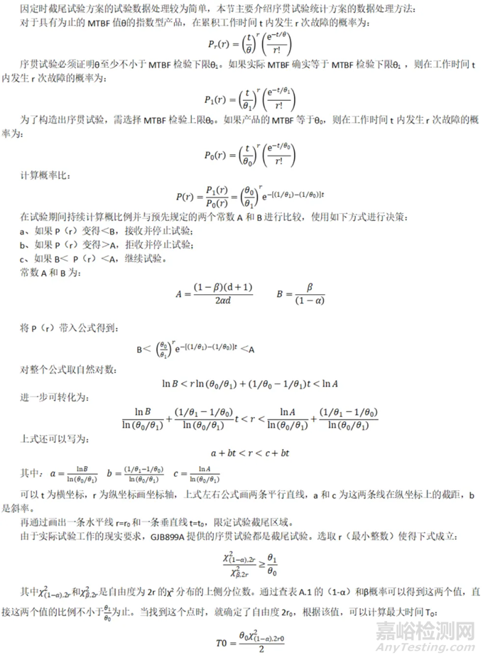 所采用的統(tǒng)計方案從GJB 899A附錄A中選取,統(tǒng)計方案應在合同或產(chǎn)品規(guī)范中規(guī)定,并在可靠性驗證試驗大綱中詳細規(guī)定。若事先未規(guī)定可靠性驗證時間,并希望盡早對MTBF作出接收或拒收判決時,可選用序貫試驗統(tǒng)計方案;若合同或產(chǎn)品規(guī)范要求進行可靠性驗證試驗,提供MTBF的驗證值,并且有固定的截止試驗時間時,必須選用定時試驗統(tǒng)計方案;若要求在可靠性驗收試驗中對每臺產(chǎn)品都進行試驗時,應選用全數(shù)試驗統(tǒng)計方案。